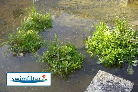 Eine gut durchdachte Bepflanzung sichert effektvolle Blütenpracht die ganze Teichsaison über. Es gilt, Schmuckpflanzen mit Pflanzen mit hoher Filterwirkung zu kombinieren. Als besonders empfehlenswerte Filterpflanzen haben sich u.a. Zwergbinse (Juncus ensifolius), Sumpfsegge (Carex acutiformis) oder der weißbunte Kalmus (Acorus calamus variegatus) herausgestellt. Das erfolgreiche Begrünen der Swimfilter ist mit gärtnerischer Beobachtung und Pflege verbunden. Bereits begrünte Swimfilter sind in mittlerweile fünf Pflanzschulen schweizweit erhältlich. Eine deutsche Pflanzschule ist in Gründung.